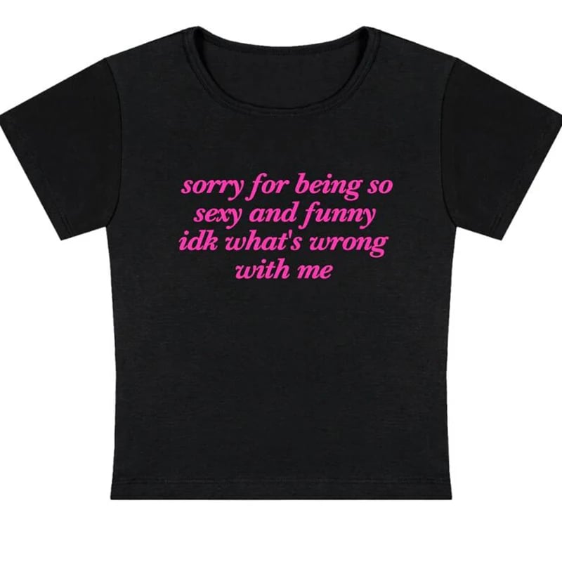 'sorry for being so sexy and funny idk what's wrong with me' printed in hot pink š